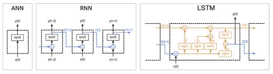 Different simplified representations of neurons of an ANN, an RNN, and an LSTM.