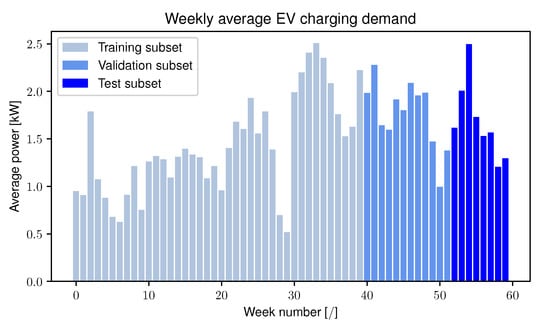 Additionally, the weekly average EV charging demand is shown in Figure 5. The figure illustrates that there are weeks with higher average EV charging demand and weeks with lower average EV charging demand. For instance, weeks 28 and 29 represent the period between Christmas and new year vacations. Consequently, the weekly variability is included in the input dataset, so that the neural networks are informed of higher or lower EV charging demand. In addition, Figure 5 shows the subdivision of the dataset into training, validation, and test subsets.