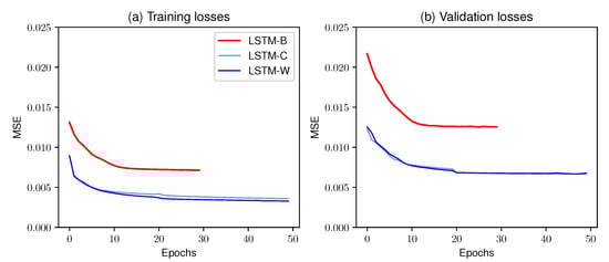 Configurations LSTM-C and LSTM-W use the Adam optimizer, similarly to [], because it combines the advantages of the RMSprop optimizer and the AdaGrad optimizer []. The optimizer is evaluated using a mean-square error (MSE) loss function since the forecast results performed better than when using the mean-absolute error (MAE) loss function.