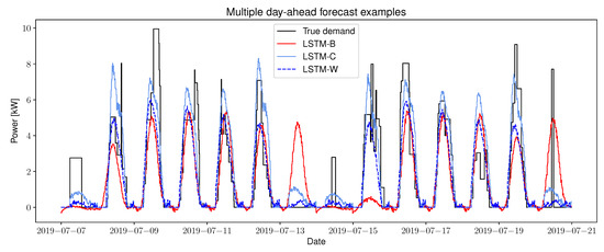 On a MAE perspective, LSTM-W performed the best, followed by LSTM-C and then LSTM-B. On a RMSE perspective, LSTM-C outperformed LSTM-W, followed by LSTM-B. This means that LSTM-C performs better in extreme cases (peak power), which can also be observed in Figure 7. In conclusion, adding calendar features increases the performance of the forecaster in extreme cases (peaks), whereas adding weather features increases the performances on MAE perspective.