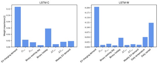 The aggregated EV charging demand of the past 24 h feature has an important weight for both neural networks. This was expected since it is a inherent feature required by recurrent neural networks. For LSTM-C, the neural network allocates an important weight to the binary holiday feature. Regarding LSTM-W, the two additional weather features have also an important weight in the neural networks. The other LSTM-C and LSTM-W features have, to a greater or lesser extent, the same weight for the neural networks.