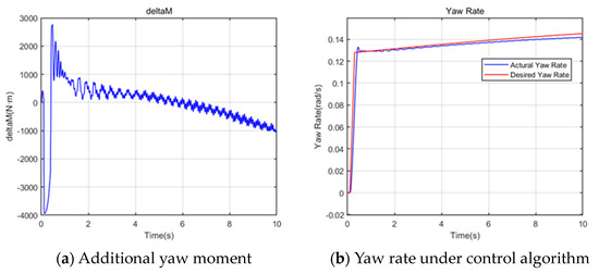 When using the LQR method, it is crucial to establish a cost function. This paper uses the cost function expressed in Equation (19) to evaluate the relationship between the vehicle motion state and the additional yaw moment. This cost function can perform the real-time adjustment of the control quantity and make the optimal decision of the additional yaw moment at all times.