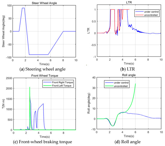 It can be seen from Figure 9a that the steering wheel quickly turns left to the 90° position in 1 s and then maintains it for 0.25 s. Afterward, the steering wheel quickly turns to the right to the −90° position and then slowly returns to the initial position after holding for 3 s. The steering wheel is held for 2 s after returning to its original position. During the whole process, the steering wheel has a maximum rotation angle of 90°. This working condition can simulate the situation of emergency obstacle avoidance. It can be seen from Figure 9b that under the action of no stability control algorithm, the calculation of the LTR of the vehicle has stopped in more than 5 s, which indicates that it has completely rolled over at this time. However, the LTR value of the vehicle under the action of the stability control algorithm can return to normal, which proves that the roll control is effective. The roll angle and roll angular velocity are the indexes of the presented control quantification. It can be seen from Figure 9d,e that under the action of the stability control algorithm, the vehicle roll angle and the roll angular velocity can gradually return to a stable state when the LTR reaches 1. If the vehicle is not applied with stability control, its roll angle and roll rate sharply increase at 5 s, and finally, instability and rollover occur. It can be deduced from the specific data of the simulation that for 0–3 s, the intervention of the stability control algorithm has no significant influence on the roll angle curve of the vehicle. Within 3–6 s, the maximum roll angle of the vehicle without the stability control algorithm reaches 34.03°, while that with the stability control algorithm is only 6.44°. By comparing the specific data in Figure 9d, it can be deduced that the stability control algorithm can reduce the maximum value of the roll angle by 81.1% within 3–6 s. In addition, within 3–6 s, the maximum value of the vehicle’s roll rate without the stability control algorithm reaches 55.62 °/s, while that with the stability control algorithm is only 19.49 °/s. By comparing the specific data in Figure 9e, it can be seen that within 3–6 s, the stability control algorithm can reduce the maximum value of the roll angular velocity by 65.0%. It can also be seen from Figure 9f that under the action of the stability control algorithm, the vehicle’s lateral acceleration can gradually return to a steady state. Conversely, if no stability control is applied to the vehicle, its lateral acceleration will exhibit drastic changes until it eventually rolls over. By comparing the specific data in Figure 9f, it can be observed that the amplitude range of the lateral acceleration of the vehicle without adding the stability control algorithm is [−4.07, 5.38]. The amplitude range of the vehicle lateral acceleration added to the stability control algorithm is [−4.12, 4.28]. The stability control algorithm reduces the magnitude of the vehicle’s lateral acceleration by 11.1% throughout the simulation. Figure 9g shows that without the intervention of the stability control algorithm, the vehicle’s driving trajectory significantly deviates. Since the vehicle rolls over in the middle of driving, its driving distance is relatively short in the simulation. It can be seen from the simulation experiment of the fishhook condition that the roll stability control strategy has a good control effect.
