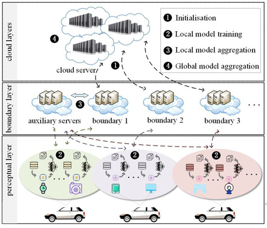 As illustrated in Figure 1, the proposed system model contains three layers: the cloud layer, the edge layer, and the perception layer. The cloud layer is responsible for the aggregation of the global model, the Edge layer, which includes edge servers and auxiliary servers, is responsible for the secure and robust aggregation of local models, and the IoV devices of the perception layer are responsible for data collection, model training, and gradient perturbation. The specific operation process is divided into the following four steps: