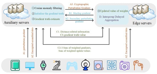 Step 1: After the edge server  receives , it calculates  to obtain . To prevent the auxiliary server from directly viewing the device’s gradient information, it randomly selects  for blinding treatment, calculates , and returns it to the auxiliary server. The auxiliary server decrypts it to obtain . The auxiliary server, having gradient information  and , can obtain the cosine distance to obtain .