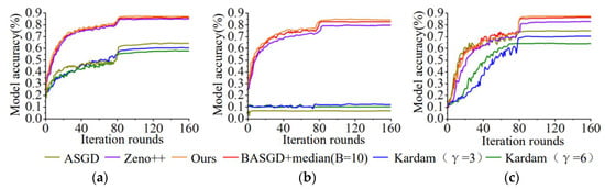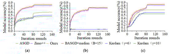 Model accuracy comparison on CIFAR-10 and q = 20%. (a) Symbol flipping attack. (b) Noise attack. (c) Gaussian attack.
