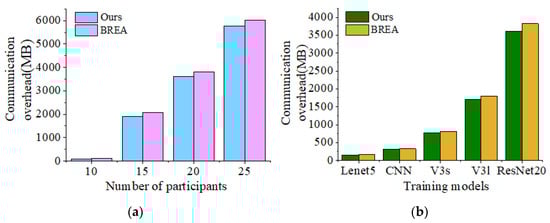 Communication overheads of the proposed method and BREA on CIFAR-10. (a) Communication overhead of participants. (b) Communication overhead of training model.