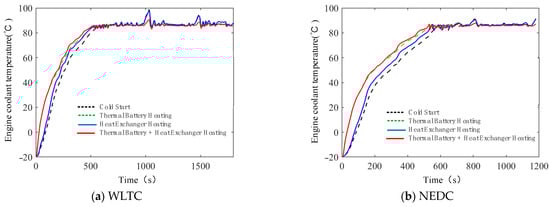 When subjected to an ambient temperature of −20 °C, the comparison between the simulation curve and the experimental curve for coolant temperature during engine warm-up is presented in Figure 10. It is evident that the experimental value of the engine outlet water temperature closely aligns with the simulated value. Throughout the warm-up phase, the simulated engine water temperature exceeds the experimental value, with a maximum temperature differential of only 4 °C; thus, the accuracy of the engine thermal model has been validated. However, since the overall thermal model also includes the thermal battery and the corresponding pipeline models and may vary slightly under different temperature conditions and operating scenarios, there are still certain uncertainties in the simulation accuracy. Nonetheless, as a proof-of-concept study, this model remains valid.