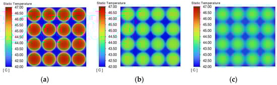 Temperature distribution of battery pack with different PCM thickness. (a) 2 mm. (b) 4 mm. (c) 6 mm.