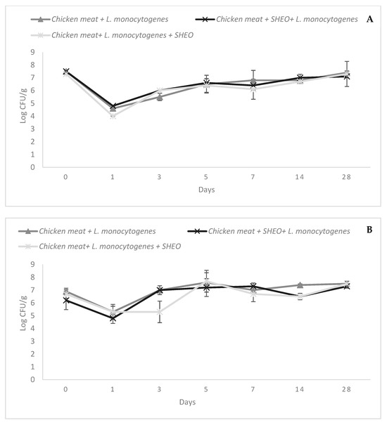 This phenomenon may be attributed to the loss of volatile properties of SHEO at low temperatures. Notably, a significant effect was observed on day 28 (p = 0.001). The results indicated that vacuum packaging at −20 °C was inadequate to sustain the effect of SHEO (Figure 3C). Overall, these findings highlight the necessity of adopting multifaceted approaches that integrate innovative antimicrobial solutions such as EO with advanced packaging and detection methods to mitigate the risks posed by L. monocytogenes in food products, thereby enhancing food safety standards [68].