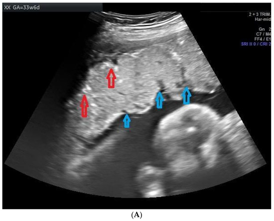 - Harris, R.D.; Alexander, R.D. Ultrasound of the placenta and umbilical cord. In Ultrasonography in Obstetrics and Gynaecology; Callen, P.W., Ed.; W.B. Saunders: Philadelphia, PA, USA, 2000; pp. 602–604. [Google Scholar]