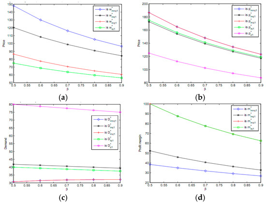 In this section, we not only compare the analytic results obtained in this paper, but also compare them with the results obtained in Wei et al. [10]. Namely, the results of RS Bertrand and MS Bertrand models where the two manufacturers do not form an alliance. We rewrite the RS Bertrand model and the MS Bertrand model in Wei et al. [10] as RNC model and MNC model, respectively, in the following discussion.
