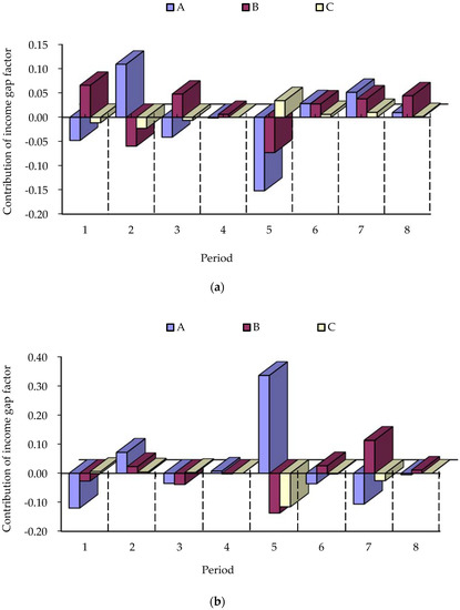 In this study, inequality decomposition by factor components is based on Shorrocks’ Gini coefficient method and Liu’s research [63,69]. Liu’s factor decomposition method is a further improvement and expansion of the Gini coefficient decomposition method proposed by Shorrocks, which analyzes the contribution of different income factors on income inequality, and explores the impact of changes in the concentration and structure of the different factors themselves on the changes in contribution of income inequality.