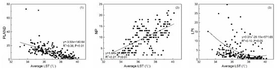 According to Figure 7, PLAND (y = 14.59x − 491.09) and LPI (y = 131x2 − 79.68x + 1189.93) of CL are well fitted to the LST curve (R2 > 0.80). NP (y = −2.65x + 104.95) and LSI (y = 0.34x − 8.57) have significant fitting with average LST.