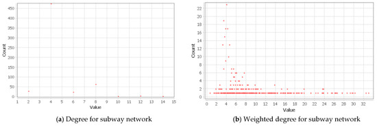 In this paper, we used a weighted network, where each link has a weight expressed in terms of the inversed distance between two stations connected by a common link. Hence, in order to identify the effect of distances and connections on station importance (in terms of degree), the weighted degree or station strength was analyzed by summing the weights of the links incident to the station in question [27,30,68,69,70,71]. For station , its weighted degree is a measure of how strong and directly connected it is in a network. The networks’ average weighted degree was also determined for comparison of the three networks using the formula;
