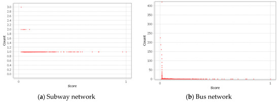 The range of clustering coefficients for individual stations in both subway and integrated networks were within the interval , whereas that of the bus network was because of the normalization factor in the formula. Overall, it is essential to note that the average clustering coefficient of the integrated network was higher compared to the other networks, indicating the presence of a higher number of tightly knitted groups within the integrated network.