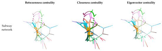 Many researchers have studied the centrality of stations in transport networks as it shows the value of stations in networks. Some studies have described node centrality as either “important” or “influential” nodes in a network [2,27,31]. In this study, we identified central stations in all of the three networks based on commonly used centrality measures such as degree centrality, betweenness centrality, closeness centrality, eigenvector centrality, and eccentricity centrality.