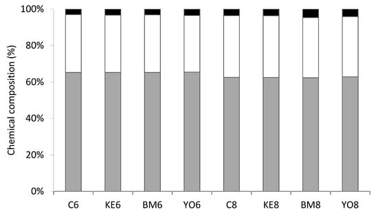 Chemical composition (%): ■ Fat, □ protein, ■ moisture of pork steaks marinated for three days in kefir, yogurt or buttermilk and cooked using the SV method. C6 = control, 60 °C; KE6 = kefir, 60 °C; BM = buttermilk, 60 °C; YO6 = yogurt 60 °C; C6 = control, 80 °C; KE6 = kefir, 80 °C; BM = buttermilk, 80 °C; YO6 = yogurt 80 °C.