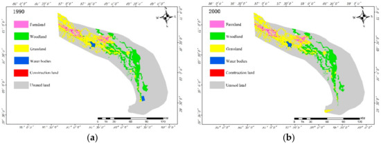 The basic data were Landsat-TM (Thematic Mapper) image data and CBERS (China–Brazil Earth Resource Satellite) data from the lower reaches of the Tarim River. Images were obtained in August 1990, 2000, 2010, and 2016 during periods of abundant water in the basin, with large amounts of water in the rivers and reservoirs. Furthermore, natural vegetation and crops were growing luxuriantly, and land features were obvious. Thus, we obtained four images. First, Erdas software was used to provide geometric correction and registration of the four remotely sensed images, whereas, for visual interpretation and digitization of the images, the ArcInfo module supported by ArcGIS 10 was used. Second, the interpretation of the river basin was revised by on-the-spot investigation and calibration, and the accuracy of the data had to exceed 80% to meet the needs of the study. Third, according to the final account of state revenue and expenditure, and the needs of the survey, the land-use pattern of the survey area was classified. According to the resources and utilization attributes, land in the lower reaches of the Tarim River was divided into six categories: Farmland, Woodland, Grassland, Water bodies, Construction land, and Unused land. Land-use in different years is shown in Figure 2.