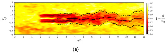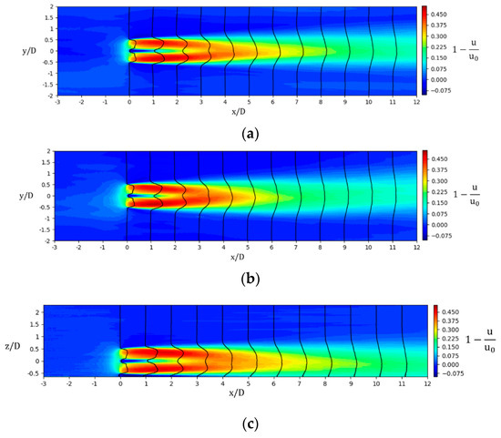 Figure 5 shows the time-average wake velocity deficit field in the hub height x-y plane and middle vertical x-z plane of both case 1 and case 5. Because the nacelle and tower of turbine are not simulated in the present study, the incoming wind flows past the rotor hub and forms a high-speed tube in the center of the near wake region. In Figure 5a,b, a similar wake evolution process is shown under both neutral and unstable conditions. The shear layer formed behind the blade tips and roots widens as it flows downstream, narrowing the high-speed tube until its disappearance at the onset of far wake region. This dividing point, however, locates at about downstream of the rotor in case 5, about one diameter ahead of that in case 1, meaning that the momentum exchange between the wake and ambient flow is more intensive in CBL. Moreover, the velocity deficit profiles in far wake region show perfect self-similarity and axial symmetry, which makes it reasonable to reproduce the profiles by a fitting curve and this technique will be used in the next part to define the wake center and edge. In Figure 5c,d, despite the wind shear to varying degrees in the vertical direction, the wake velocity distributions in different positions downstream are quite similar to those in the hub height plane in both cases. The only difference is that the expansion of the wake is blocked by the ground in far wake region, thus slowing the velocity recovery process near the ground.