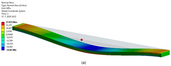 Development of normal stresses (y-axis) along the length of the cross section (x-axis) is shown in Figure 11. The bed sideboard with the standard cross section of 25 mm × 200 mm, made from the beech wood is suitable for use in terms of normal and increased stresses. The maximum values of normal and shear stress were not exceeded in the process of simulation. The design tensile strength of beech wood along the grain is ft,0,d = 35.53 MPa and the design compressive strength of beech wood along the grain is fc,0,d = 18.32 MPa. Calculated values show that the edge of bed described by the sideboard is fit for the load resulting from the excess weight of a user of 150 kg.
