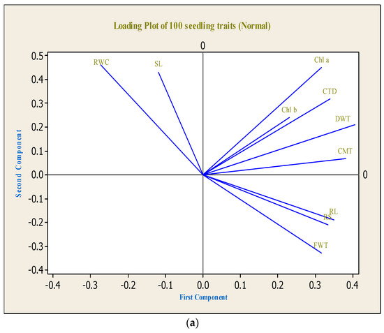 The projection of traits on PC1 and PC2 under normal conditions revealed that root length and root/shoot ratio were highly and positively related to seedling fresh weight. Relative water content and shoot length were associated with each other and had a negative relationship with all other studied traits (Figure 1a). This deviation in RWC may be attributed to differences in the ability of the varieties to absorb more water from the soil and/or the ability to control water loss through the stomata. It may also be due to differences in the ability of the examined genotypes to accumulate water and adjust osmotically. Chlorophyll a, b, carotenoid, and cell membrane thermo-stability showed a positive association with seedling dry weight, but a negative association with all other remaining traits under normal conditions (Figure 1a). The major role of carotenoid through the direct quenching of triplet chlorophyll prevents the generation of singlet oxygen and protects the plant from oxidative damage. Chlorophyll and carotenoid absorb radiant energy, which is used for photosynthesis [60,77]. The projection of traits on PC1 and PC2 under drought conditions revealed that root length, shoot length, and carotenoid were negatively associated with each other, and had no relationship with other studied traits. Chlorophyll a,b, relative water content, cell membrane thermo-stability, and fresh weight were highly and positively related to dry weight (Figure 1b).