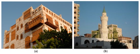 In the Kingdom of Saudi Arabia and also in the Middle East region, the city of Jeddah is considered to be one of the most important historical cities [18]. Historical Jeddah is a historical city that is known locally as Jeddah the town in the center of Jeddah, which is one of the ancient historical cities that has its great position religiously, geographically, and historically [19]. Jeddah has a significant geographical position and it is a port for the population of Mecca. It was characterized by its extensive trade and remarkable wealth. The flourishing trade was based on the activities of the Persian merchant community who settled there [20]. It was occupied by the Persian Emperor in the middle of the sixth century B.C. and was subjected to the Habashi (Ethiopian) occupation and the Portuguese threats and attacks in about 948 AH/1541 AD due to its crucial port in the marine trade [21]. Jeddah has witnessed great historical transformation since it was first cared for by the Third Rashid Caliph Othman bin Affan and it became a port of Mecca instead of the port of Shuaiba that was used by the commercial vessels of the Roman in the trade with Mecca [22,23,24]. The importance of Jeddah in the Mamluk era is obviously shown in the concerns of the Mamluk rulers to protect the two Holy Mosques and the securing of pilgrimage routes, in addition to Jeddah being a vital and important commercial port [25]. The city has been under Ottoman control since it had a vital and strategic position as an important naval station for the supply of water and fishing vessels. Since then, Jeddah has gained its historic Islamic significance, which has made it one of the most important cities on the Red Sea coast and a gateway to the two Holy Mosques [26]. The urban heritage of Jeddah is reflected in its historic neighborhoods or lanes, as it was called in ancient times [27]. Its architectural heritage characterizes the historical depth of the city of Jeddah, which includes a special collection of important historical and heritage buildings. The historical wall of Jeddah, which surrounded the city, is one of the most important historical monuments that characterized the city of Jeddah, whose parts of it still exist that were built in about 911 AH/1505 AD during the reign of the Mamluk Sultan Qansoh Ghuri [28]. In addition to the fence, a military garrison was built to protect the wall and the city from the external threats that were posed by the Portuguese threats and attacks. The fence contains six doors in order to protect the Holy Land and the Red Sea area [29]. Each door has 16 arms and a new door was added at the beginning of this century, and the wall was removed in 1947 [30]. The architectural designs of homes and houses, in Jeddah represent a special architectural character. They are part of the architectural style of the Hijaz region, which is characterized by strength, durability, and hardness. The houses were mostly constructed of skeletal stone [31]. The wooden parts, especially the doors, were decorated with various and different decorative elements, such as animal, plant, and engineering firms. On these decorative patterns were obviously foreign art effects from Europe, Egypt, Syria, and India [32,33]. Some of the archeological buildings of the city still exist, such as Al-Jamjoom House, Al-Baashen House, Al-Shaikh, Al Qabal, Al-Shafi’i Mosque, Al-Mazloum, Al-Banaja, and Al-Zahid. Additionally, many historical khans (e.g., Khan Indians, Khan Kasbah, Khan Aldalalin, and Khan At-tarin [34]). Furthermore, what attracts the attention of the beholder to this ancient city is the existence of many Islamic historical mosques, e.g., the Great Mosque and the Mosque of Uthman ibn Affan [35,36] (Figure 2a–d).