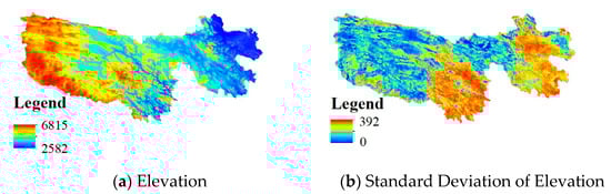 Selecting the appropriate environmental factors ensures the accuracy of the predictions. Climate (e.g., precipitation, temperature) can have an effect on species richness and human population density [36,37]. It is generally assumed that the principal factors that influence human activity are landscape and roads [38,39,40]. We also used land cover and grass yield datasets as correlative variables, which were retrieved from the National Earth System Science Data Center, National Science & Technology Infrastructure of China [41].The chosen environmental factors according to previous research are shown in Table 1. Albers projection was used in the calculation and visualization, and all the raster dataset was resampled to 30 m × 30 m resolution. Terrain factors were computed from digital elevation model (DEM) data from ASTER Global Digital Elevation Model Version 2 (ASTER GDEM2) [42]. ASTER GDEM2 was released in GeoTIFF format with a resolution of 1″ (~30 m). Terrain factors are common indicators for landscape types, and they were calculated from ASTER GDEM2 and divided into two types based on the calculation scope. One represents micro factors of a 90 m scope; the other represents macro factors of a 21 km scope. Together, they can delineate the landscape of the Sanjiangyuan region.