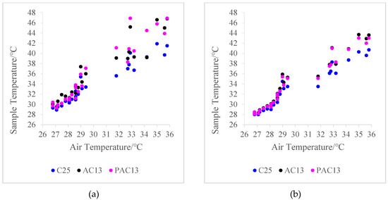 Figure 4a–d depicts the relationship between the pavement materials temperature and the air temperature at the same time. Figure 5a–d depicts the relationship between the pavement materials temperature and the solar radiation intensity at the same time.