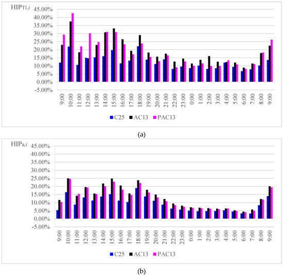 Heat island potential (HIP) as a quantitative indicator was proposed to evaluate the effect of pavement materials on UHIE at specific times and specific locations, which is defined as Equation (2).