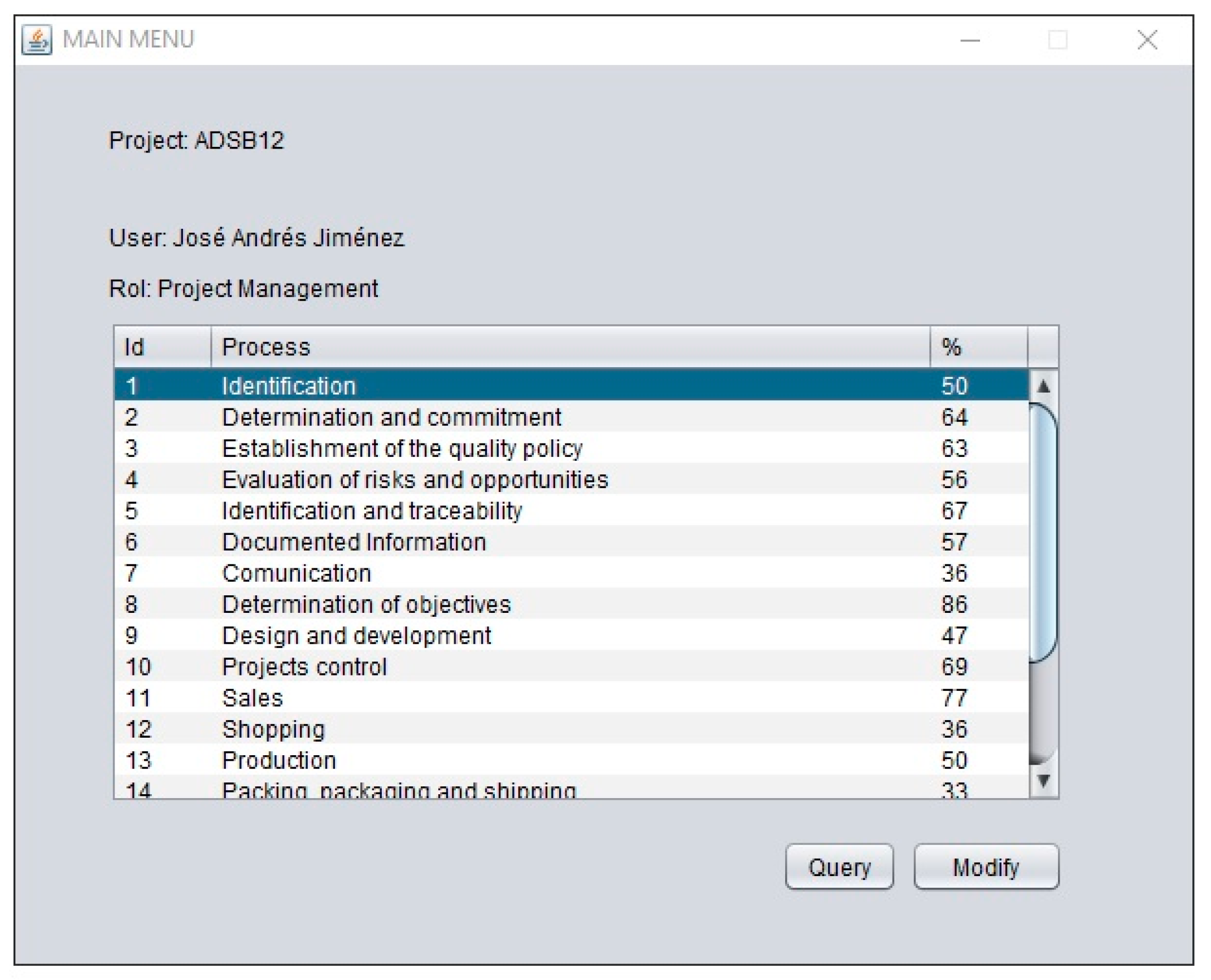 - The application has two distinct user profiles: the administrator and the standard user. The administrator profile can do maintenance and system management operations, such as updating the knowledge base and registering new users and projects. The standard user profile can do the evaluation of the processes of a project and the monitoring of its evolution through different graphical tools of analysis.