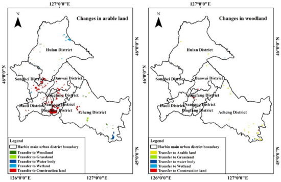 In the change of arable land, as shown in Figure 2, 73.5% of the areas converted to construction land are mostly located in Nangang district, Xiangfang district, and Pingfang district, which is due to Harbin’s “South Extension” policy. The other parts of the conversion to ecological land were due to “Grain for Green” and other policy actions such as ecological protection and land consolidation.
