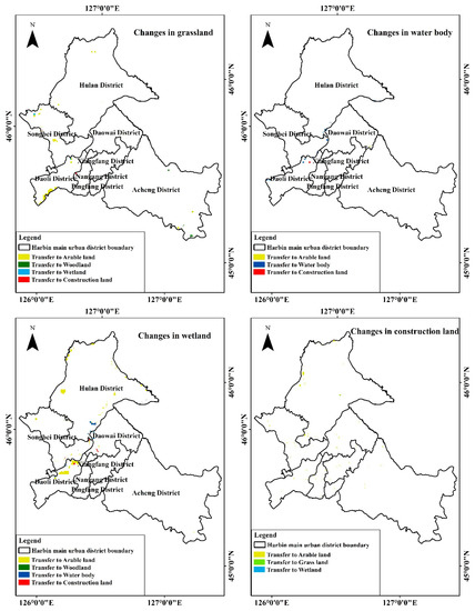 The woodland in the study area is concentrated in the southeast of the study area, which is located in the hilly area adjacent to the residual vein of Zhang Guangcai Ridge. The total change is small and scattered. Most of its changes have been through conversion to arable land, which is located in Acheng district. The proportion of grassland area in the study area is not large, and about one-third of the area has been converted to arable land, while the others were not more than 3 km2. Most of the changed areas are located in the south of Daoli district, and in the middle and north of Songbei district. Songhua River passes through the central part of Harbin City, most of the water body and wetland are transformed into each other, the part converted into other categories of land use/cover. Among them, the area of water body converted into wetland was the highest in the water body conversion area, while the area of the wetland that was converted into arable land was the highest of converted into arable land area. There are parts of construction land that were converted into arable land, grassland, and wetland, mostly located in the central and eastern parts of Hulan district [39,40,41], but the total area was small, and the biggest part was converted into arable land.