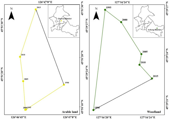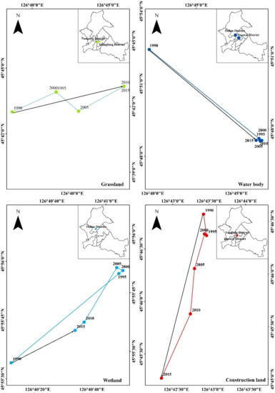 The shift of land use barycenter represents the situation in which a land pattern is used in the study area. The United States made calculations in the 1970s about the shift of barycenter of the U.S. population from the mid-19th century to the 1970s. The barycenter of land use/cover is proposed based on the barycenter theory of population distribution, which is used to characterize the spatial position and change of the barycenter in the process of land development and utilization. The position of the barycenter is generally expressed by the latitude and longitude of the map [28,29]. In this study, we used ArcGIS software to calculate and produce the figure.