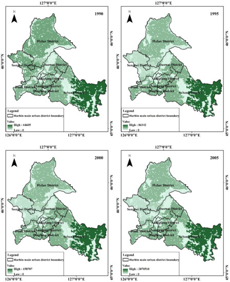 Urbanization is the inevitable trend of the development of human society and the inevitable outcome of economic and technological progress. Urban fringe expansion and resource urbanization are inevitable. As a central city in northeast China, the urbanization development of the research area over the years is obvious to all. The new development strategy of “North Jump, South Extension, Central Prosperity and Strong County” formulated by the seventh Plenary Session of the 12th Harbin Municipal Committee of the CPC (Communist Party of China), has detailed Harbin’s future plan. Looking up the data, we can find that, in addition to the expansion of construction land in the central area of the research area, Songbei New district has recently built a new high-tech development zone, The World of Ice and Snow, The Siberian Tiger Park. Similar to the interpreted image data, the changed areas for construction land are distributed in Songbei district, Pingfang district, Nangang district, and Xiangfang district, significantly reducing the value of ecosystem services in the central region where the center of Harbin’s main urban area is located. This shows the same trend as the urbanization process in most cities in many developing countries. The rapid expansion of construction land at the expense of ecological land has led to a significant reduction in the value of ecosystem services in the areas developed [48,49,50,51].