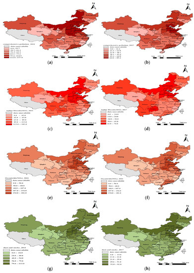 Figure 3c–h shows the spatial distribution of SO2, NOx, and DS. Their geographical distribution laws are similar. The peaks of SO2, NOx, and DS emissions are in the provinces of Northeast China: Shandong, Hebei, Inner Mongolia, Liaoning, Jiangsu, and the southern province Guangdong.