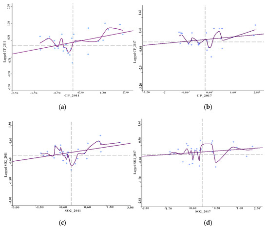 Although we have calculated the global Moran index of air pollution, renewable energy green innovation, and fossil energy consumption, the global Moran index cannot detect local spatial associations, so we drew Moran’s I scatter plots for 2011 and 2017, as shown in Figure 4.