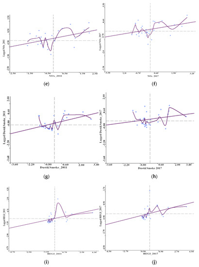 According to Figure 4a,b, in the Moran’s I scatter plots of comprehensive air pollutants in 2011, there are 20 sample points (66.7%) in the first and third quadrants, and this number is 19 in 2017 (63.3%). Figure 4c,d shows that in 2011 Moran’s I scatter plots of SO2 had 14 sample points (46.7%) located in the first and third quadrants, while in 2017 it dropped to 12 (40%). Figure 4e,f shows that there were 18 sample points (60%) of NOx in the first and third quadrants in 2011, and 19 (63.3%) in 2017. The number of dust and smoke (DS) is 24 (80%) in 2011 and 20 (66.7%) in 2017. As for the renewable energy green innovation, the sample points in the first and third quadrants in 2011 and 2017 remained 22 (73.3%). For fossil energy consumption, there were 19 sample points in the first and third quadrants in 2011 (63.3%), and 21 (70%) in 2017.