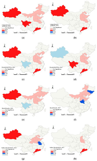 Figure 5a–h shows that the H–H cluster of China’s comprehensive pollution (CP), oxynitrides (NOx), dust and smoke (DS), and sulfur dioxide (SO2) is highly overlapped in Henan, Shandong, Hebei, Shanxi, and Shaanxi in 2011. However, this pollution discharge aggregation phenomenon was significantly alleviated by 2017. The number of provinces in the H–H cluster decreased significantly in 2017. In 2011, the comprehensive pollution (CP), oxynitrides (NOx), dust and smoke (DS), and sulfur dioxide (SO2) H–L clusters were mainly concentrated in Guangdong and Xinjiang, and their pollutant emissions far exceeded the surrounding provinces. By 2017, only Guangdong was left in the H–L cluster of the above three pollutants.