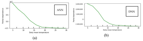 Partial Dependence Plots for the dataset of Athens on the mean daily temperature for the ANN (a) and the DNN (b) models, and the energy consumption values of 1-day (c) and 2-days (d) prior.