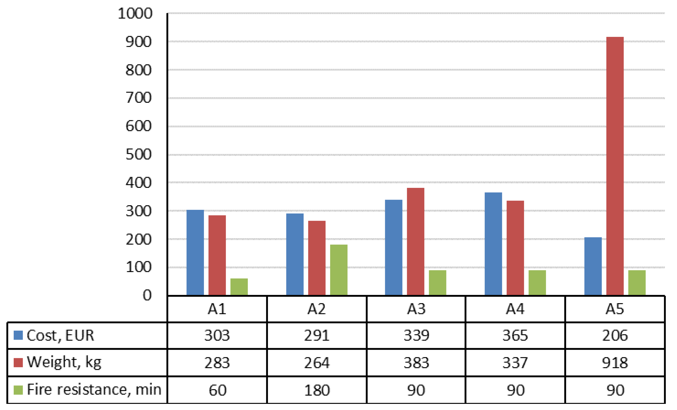 | A5 | The area of the beam cross-section is 0.085 m2; length is 5.4 m; volume is 5.4 × 0.085= 0.459 m3; weight is 2000 × 0.459 = 918 kg (reinforced concrete density 2000 kg/m3). | As reinforced concrete manufacturers claim, the cost price of the beams of such type is about 450 Eur/m3. The cost of the researched reinforced concrete beam is—450 Eur/m3 × 0.459 m3 = 206.55 Eur. | Fire resistance class determined by the manufacturer is up to R90 when the protective concrete layer’s thickness is 55 mm. Fire resistance R90. |
