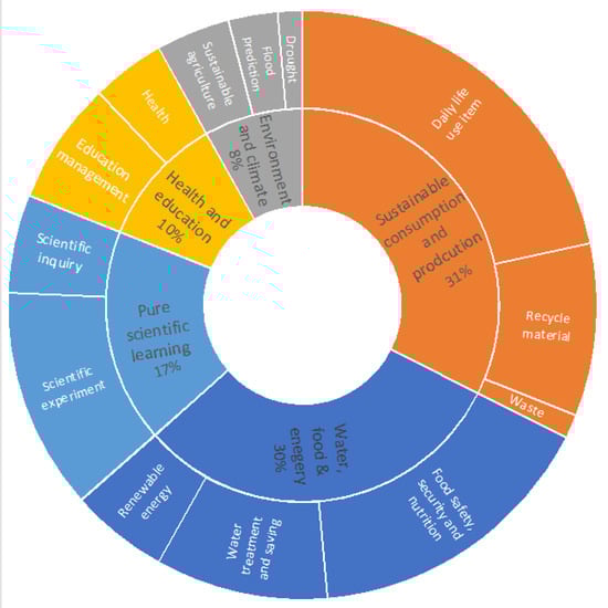 In addition, Figure 2 shows the development themes were used by the teachers to develop their STEM teaching projects. Although no suggestions were given to the teachers about the types of topics for their projects, most of the projects were related to the SDGs that have a local impact as well as global relevance, such as sustainable consumption and production, water availability and quality, sustainability of energy, and sustainable agriculture and food production. For instance, 31% projects were designed to teach students to create simple sustainable daily life use objects or products, recycling materials and waste management. In total, 30% of projects focused on food safety and food security, water treatment and saving and renewable energy. These projects were also designed to teach health protection and education (10%) and flood prediction, drought mitigation and agri-environmental protection (8%). In short, the majority of projects (83%) were used real-world issues and phenomena such as the premise of the lecture objective, whereas only 17% of projects were purely scientific experiment and inquiry.