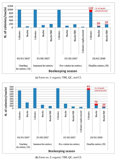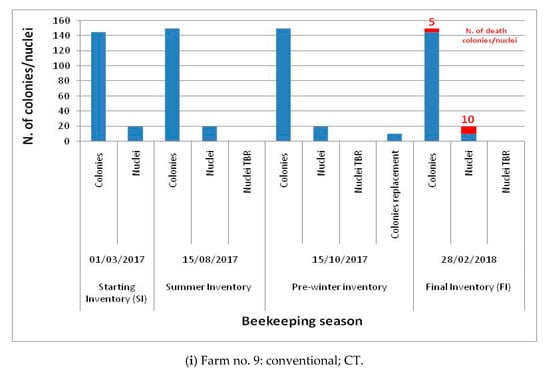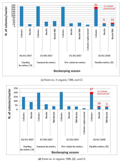 The situation of beehive stocks that emerged in the nine beekeeping farms analyzed is shown in Figure 2. Generally, all nine beekeeping farms recorded winter mortality in colonies and nuclei, and there were no sales and purchases at the farm level. In particular, beekeeping farm number one showed an SI (01/03/2017) equal to 1070 (1000 colonies and 70 nuclei). During the spring and summer, another 70 nuclei were obtained by breeding and a further 200 nuclei were produced by the TBR technique applied to fight Varroa mites (TBR nuclei); in the record concerning the summer period (15/08/2017), 1,000 colonies and 340 nuclei were present in the beekeeping farm stock. In the pre-winter time (15/10/2017) some colonies died and others were used for replacement (40); the stock consisted of 990 colonies, 100 nuclei and 180 TBR nuclei. The FI (28/02/2018) was equal to 880 colonies + 250 nuclei, 170 of which originated from TBR. The winter mortality rate was 11%. Farm number two presented 750 colonies and 250 nuclei in the SI. In the summer, 850 colonies and 250 nuclei (100 of which were derived by TBR) were counted in the stock. In the pre-winter time, the stock consisted of 843 colonies and 200 nuclei; 80 nuclei originated from TBR. A total of 60 colonies were used for replacement. In the FI, 780 colonies and 190 nuclei (60 of which were TBR nuclei) were present, and the winter mortality rate was 14%. In farm number three, 190 colonies and 20 nuclei were counted in the SI, while 50 nuclei were produced by applying TBR, and another 45 nuclei and 190 colonies were present in the summer time. In the pre-winter inventory, there were 186 colonies and 65 nuclei (35 of which were TBR nuclei); 15 colonies were employed for replacement. The FI showed a stock consisting of 165 colonies, 25 nuclei, and 24 TBR nuclei, and the winter mortality rate was 15%.