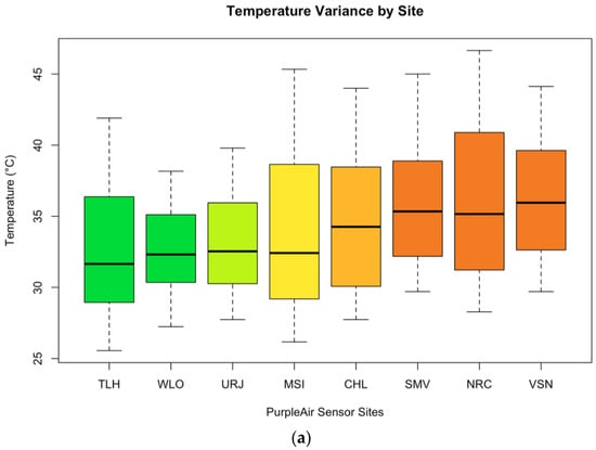 We first compared the temperature between the eight sample locations. This project follows from a previous study that measured the urban heat island effect (UHI) in Richmond. Shandas et al. combined satellite and ground temperature measurements to map UHI throughout different times of day []. From these earlier data, we were able to predict which sensors were located in hotter versus cooler areas of the city. We used these predictions to help determine locations for the sensors as part of the sample design, and we validated the temperature predictions with the sensor data using an analysis of variance (ANOVA) test and the post hoc Tukey’s range test. These analyses were conducted in R version 1.2.1335 and included the eight sensors aggregated by hourly average temperature distributions for the ten hottest days. Differences in temperature among the sensors were highlighted at the 95% confidence level. These findings were remapped onto the city landscape to visualize the spatial patterns.