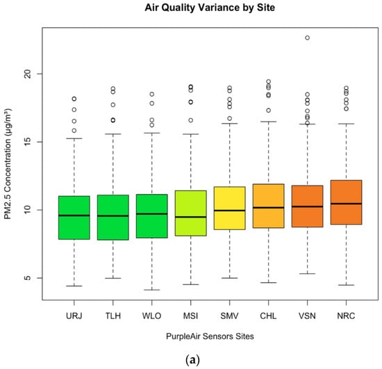 It should be noted, however, that despite the high inter-sensor correlation exhibited among sample PA-IIs (as shown in Section 2.3), it cannot be ruled out that disparities between PM2.5 readings among the eight sensors analyzed could be explained in part due to random chance. While Malings et al. found the mean absolute error of PA-II units for short-term measurements to be of similar magnitude to some of the differences among sites observed in our study, they reported long-term annual errors to be less than 1 μg/m3. This finding suggests continued monitoring of these sites. To mitigate uncertainty surrounding potential inter-sensor variability in continued and/or replicating research with low-cost sensors, calibration via inter-sensor validation and normalization with a reference instrument before sensor deployment are encouraged to provide an additional layer of confidence in the accuracy of readings [].