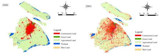 The land use data, with a spatial resolution of 30 m, were obtained from RS images by supervised classification [40]. In order to improve the accuracy of the classification results, the land use data of Shanghai (Figure 3) from 2000, 2004, 2007, and 2015 were obtained through manual visual interpretation and corrected based on high-resolution Google Earth images. Field trips were also conducted when images could not clearly indicate land use. The land use was classified into five types: Constructive Land (CL), Green Land (GL), Wetland (WL), Agricultural Land (AL), and Bare Land (BL).