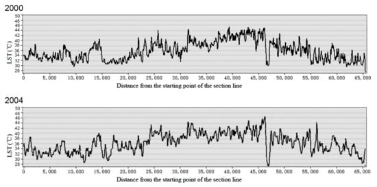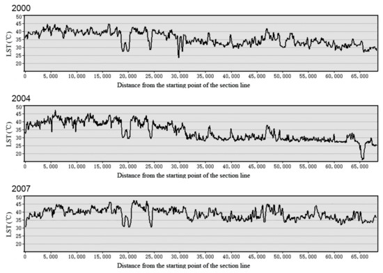 Figure 6 and Figure 7 show that the LST trend on the meridian line was high in the north and low in the south in all years, while the LST trend on parallel line was high in the middle and low on both sides before 2007. This reflects that it passed through suburban area, urban areas, and then suburban areas again. The UHI effect trend is well shown on the waveform. After that, the LST curves on the parallel line become gentle.