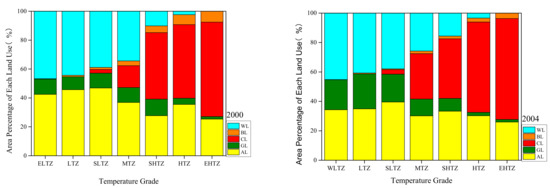 According to Figure 12, the ratio of the five types of land use in different temperature zones were significantly different. However, the result of each year showed the same features. CL was the largest portion of EHTZ and HTZ. This indicates that CL contributes the most to the UHI effect. WL, GL, and AL was the largest part in SLTZ, LTZ, and ELTZ.