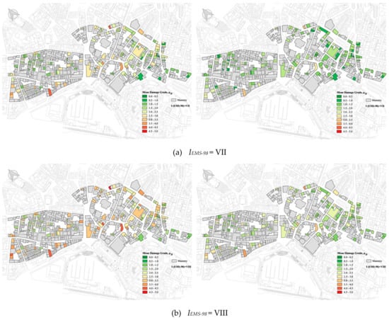 From the analysis of Figure 6, it can be noted that, for a seismic scenario with an intensity equal or higher than VIII, most of the buildings considered in this analysis present mean damage grades of Dk = 4 and Dk = 5, which means severe damage or collapse.