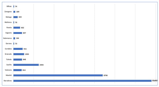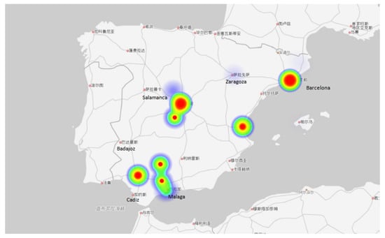 Despite the discontinuity caused by COVID-19 regarding the entry of Chinese and international tourists into Spain in 2020 (UNWTO []), China’s tourism has enormous potential. Chinese tourism in Spain is low, with 699,000 Chinese residents visiting Spain in 2019 (0.8% of the 83.7 million foreign tourists who visited in Spain in 2019), although Chinese tourism has greatly developed since 2015, when Spain received 399,000 Chinese tourists (0.3% of the total) [].